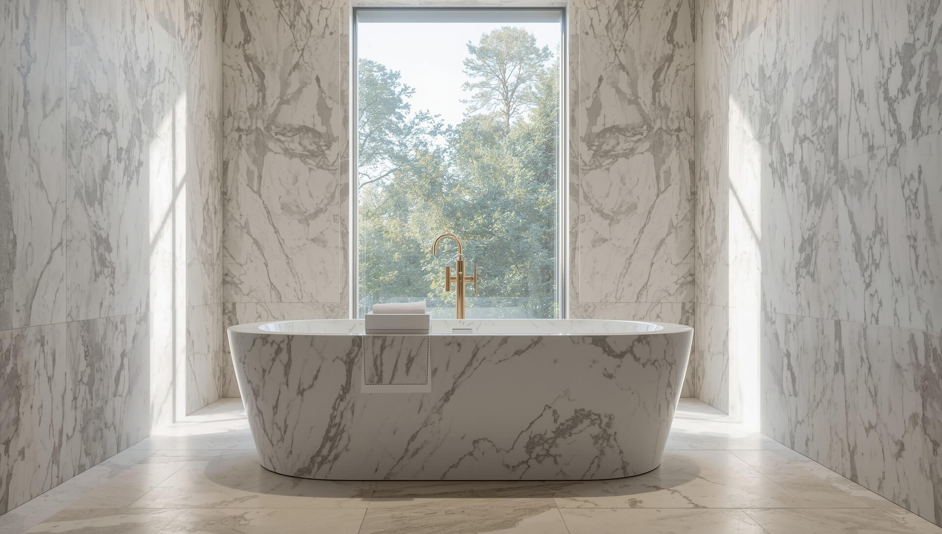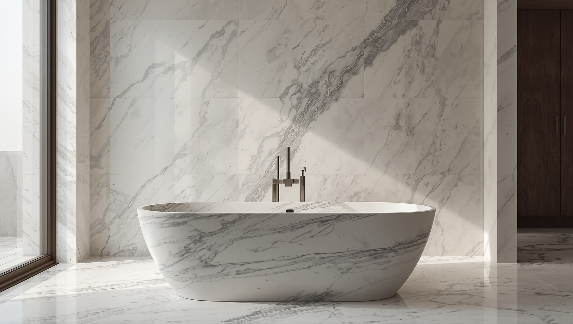 Carved from a single block of marble, travertine, or dolomite, Selene emphasizes material authenticity. The outer form transitions smoothly into a refined rim profile, reducing visual heaviness without compromising durability. Unlike aggressively sculpted freestanding tubs, Selene avoids sharp angles and dramatic gestures. The result is calm, deliberate, and architecturally stable.